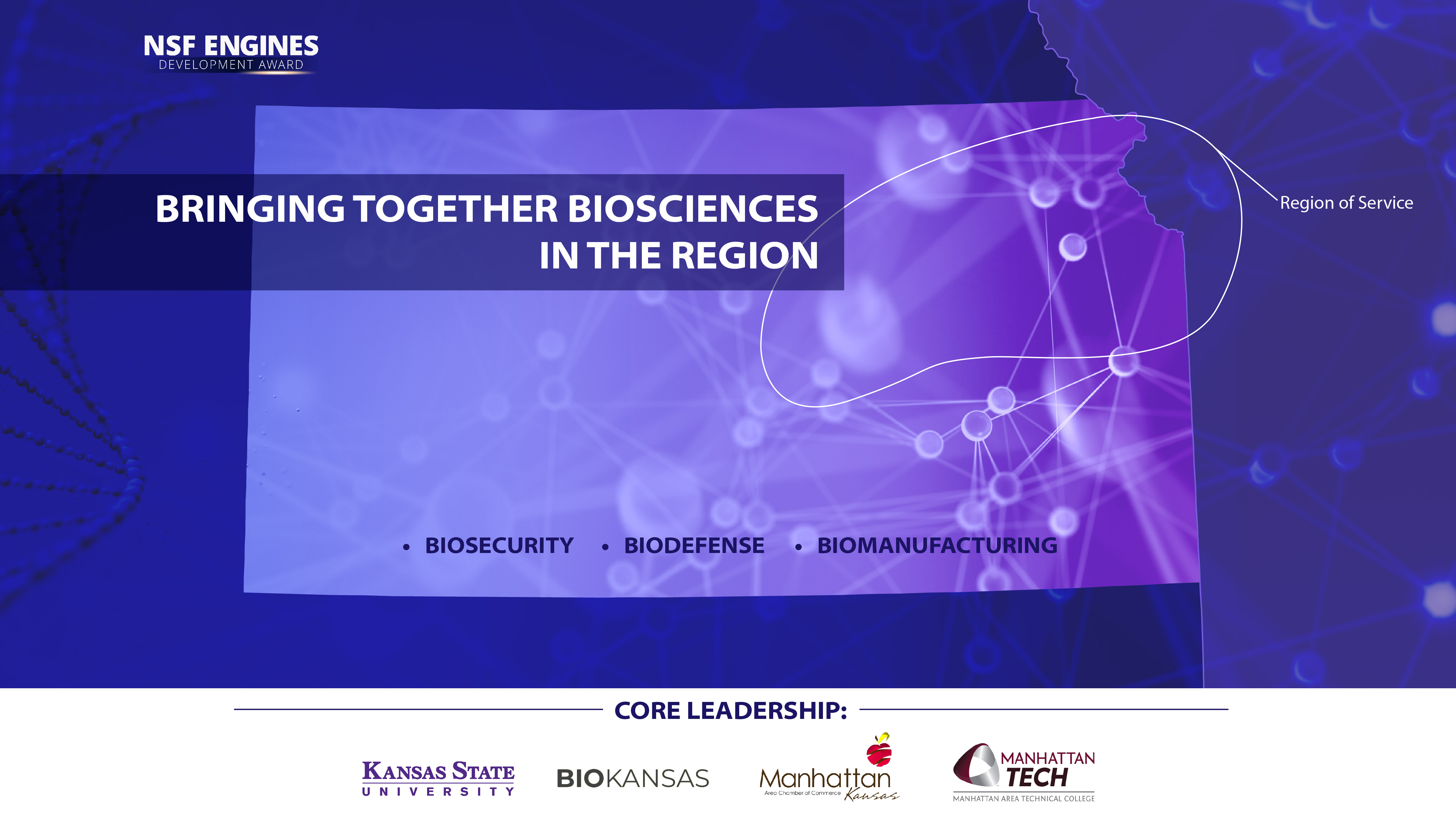 MANHATTAN — The Advancing Biosecurity, Biodefense, and Biomanufacturing Technologies project has been awarded $1 million from the U.S. National Science Foundation's Regional Innovation Engines, or NSF Engines, program. The project team includes core partners from Kansas State University, Manhattan Area Technical College, BioKansas, K-State Innovation Partners and the Manhattan Area Chamber of Commerce.